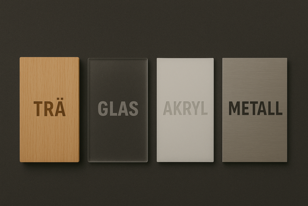 Vi arbetar med exempelvis trä, glas, akryl och metall – valda för att ge ett tydligt, hållbart och estetiskt resultat i gravyr. Material och utförande anpassas efter produkt, kundgrupp och användningsområde.