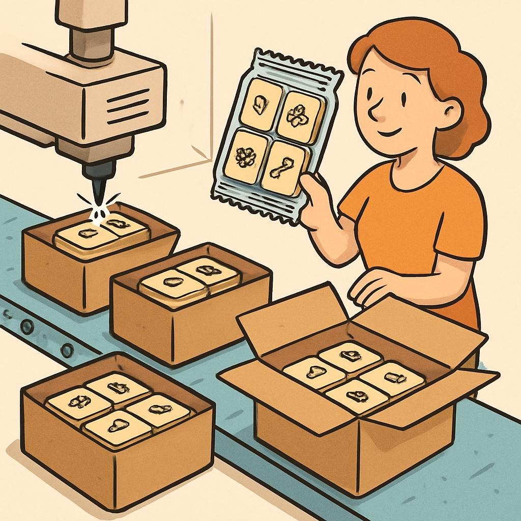 Färdigpaketerade produkter, tydlig märkning och smidigt flöde.